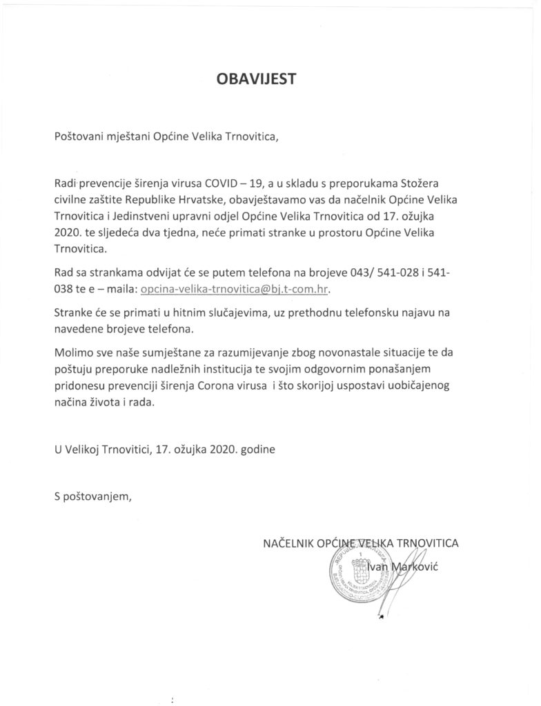 Obavijest o ograničenju primanja stranaka Općina Velika Trnovitica