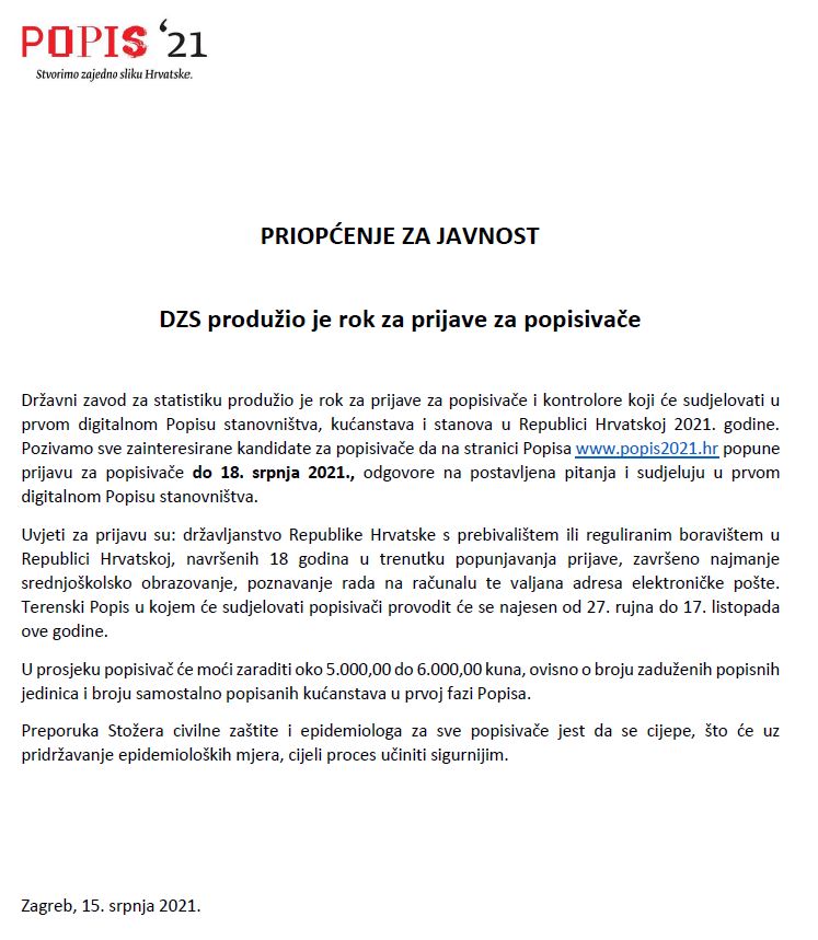 Priopcenje za javnost_DZS produzio je rok za prijave za popisivace