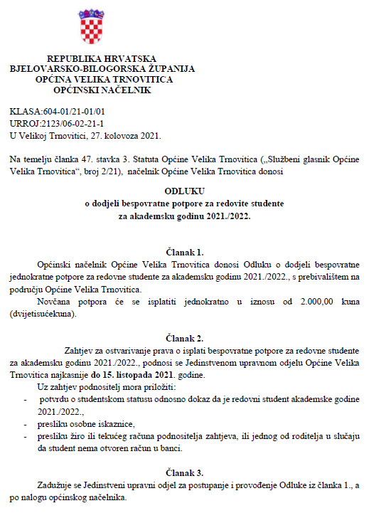 Odluka o isplati bespovratne potpore za redovne studente za akad